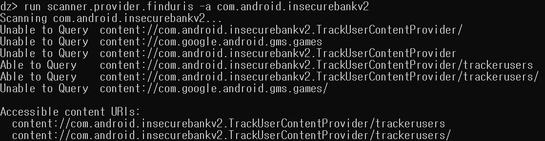 scanner.provider.finduris -a package_name 명령어는 Content Provider의 URI 주소를 검색해서 접근 가능한 목록들을 찾아주고, Unable to Query와 Able to Query로 구분해서 실질적으로 Accessible한 content URI들의 목록까지 출력해준다.