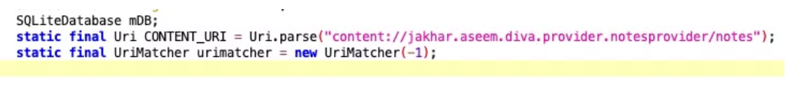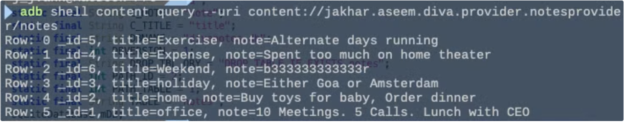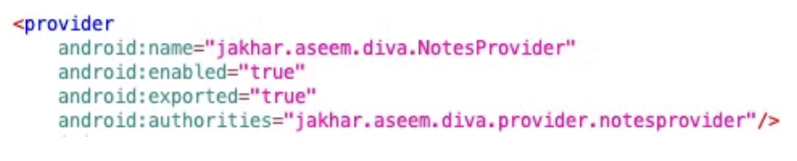 해당 문제에선 NotesProvider의 exported값이 true로 되어 있어서, provider를 통해서 외부에서 content를 불러올 수 있다.