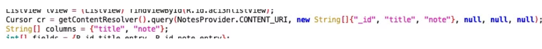 Cursor cr = getContentResolver().query(NotesProvider.CONTENT_URI, new String[]{"_id", "title", "note"}, null, null, null);