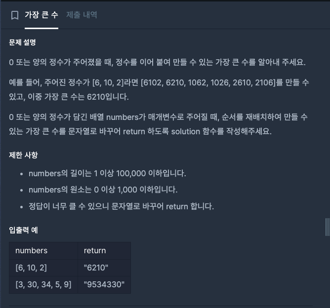 30, 9 -> 930이 더 크기 때문에 스위칭,, 여기까지 했을 때 -> [3,34,5,9,30] 이렇게 정렬이 될 것이다. 아무튼 비교 함수를 a + b > b + a로 만들었을 때 결국에는 [9, 5, 34, 3, 30]로 정렬될 수 있다. + 만약 정렬 시 가장 앞에 오는 수가 0일 경우에는 0으로 return 되어야 한다.