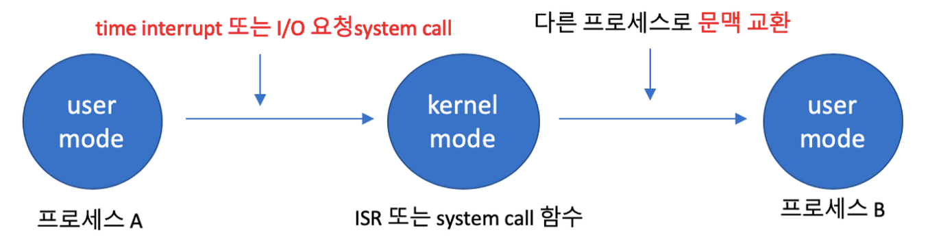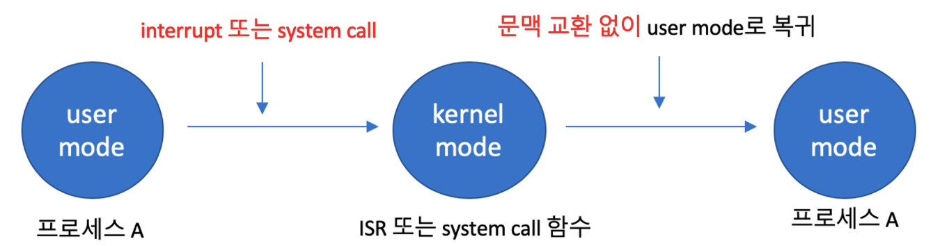 • 이는, 하나의 프로세스가 사용자 모드에서 실행되다가, 커널 모드로 실행 모드만 바뀌는 것일 뿐 CPU를 점유하는 프로세스가 다른 사용자 프로세스로 변경되는 과정이 아니기 때문이다.