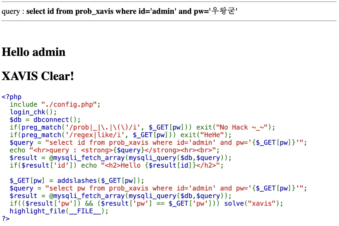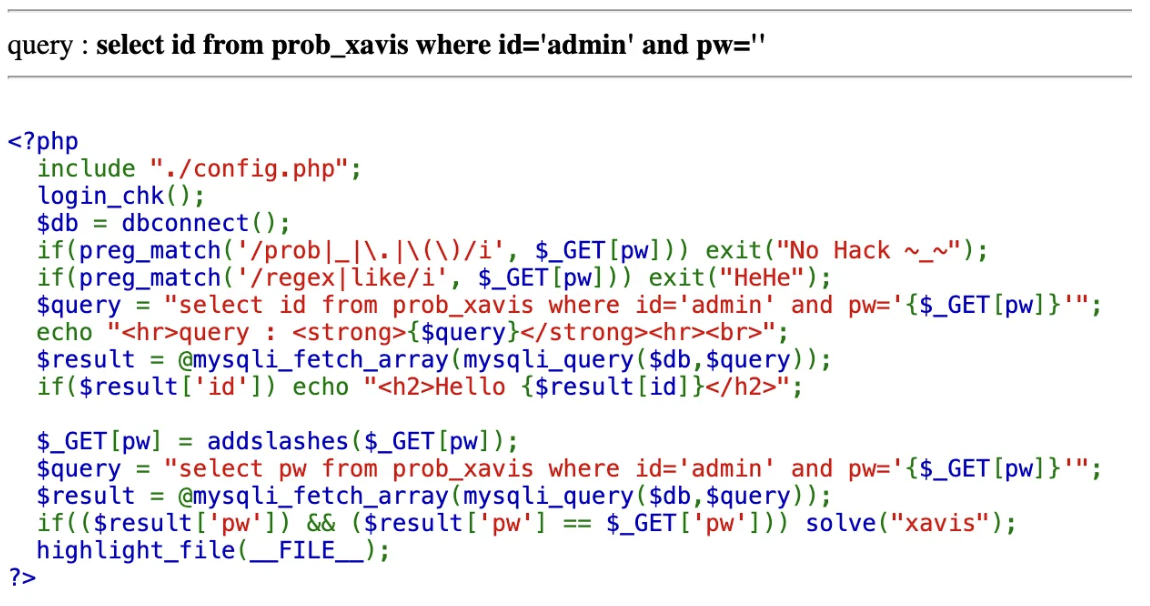 그리고 addslashes 함수가 적용이 되어 있다. 이번에는 strrev가 적용되지 않았기 때문에 만약 ‘를 입력값으로 주면 \’으로 들어간다. 근데 이제 query로 보여지는 것은 \’로 보여지지 않고 pw=''' 이렇게 보여지기 때문에 우선 pw를 blind sql injection으로 알아낼 수 있다고 판단. 참이게 되면 hello admin이 뜰 것이기 때문!!