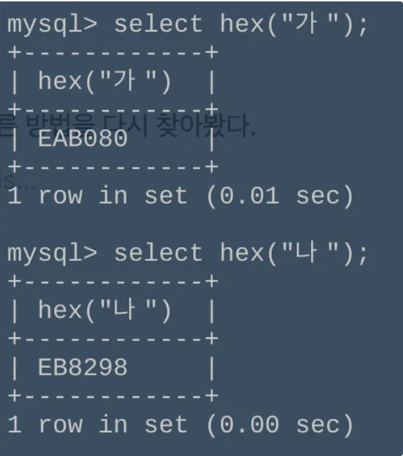 mysql을 실행시켜서 ascii 말고 다른 함수로 어떻게 영어가 아닌 멀티바이트 글자를 처리하는지 한번 확인해봤다.
