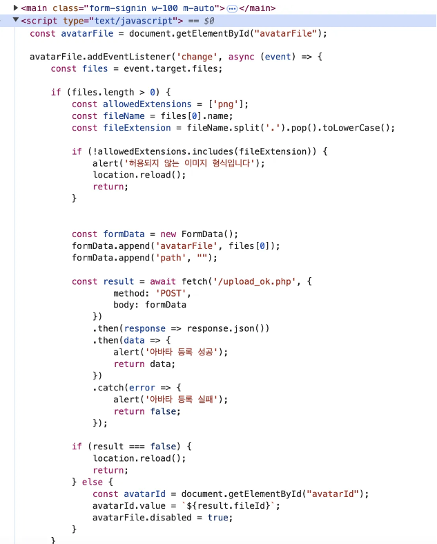 우선 클라이언트단에서 js로 png를 제외한 다른 이미지 파일은 허용되지 않게 했다.