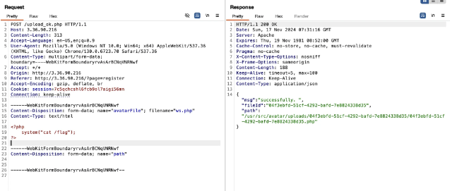 하지만, burp로 아래와 같이 파일 확장자를 변경해서 request가 가능하다. 확장자와 content type도 아래와 같이 변경가능하고 내 경우에는 업로드시에는 png로 업로드를 하고 파일이름, 타입, 값을 수정해서 request를 하고 업로드가 된 응답값을 받을 수 있었다.