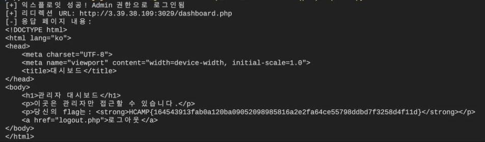 관리자 대시보드에 접속하게 되면 최종적으로 flag를 확인할 수 있다.