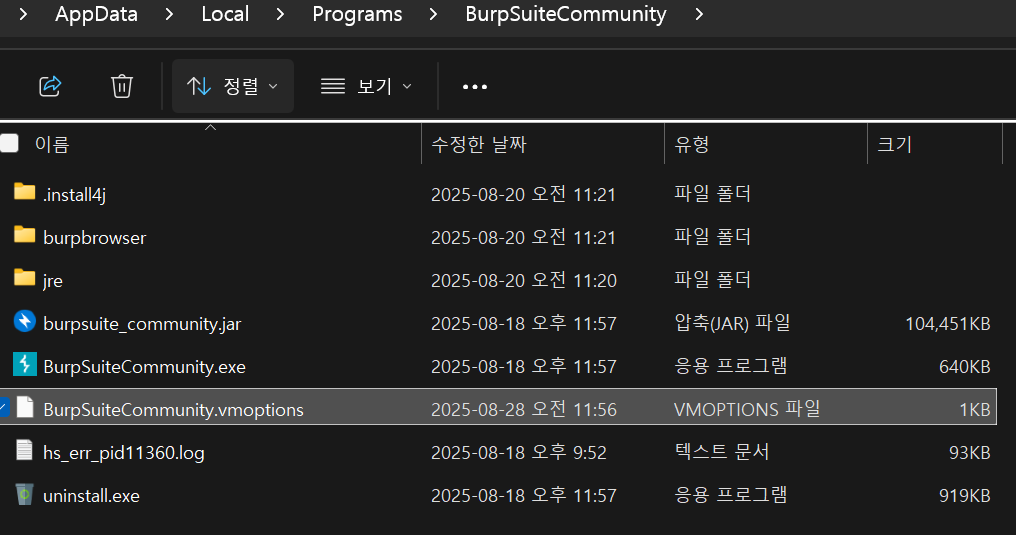 1. 아래와 같은 경로의 BurpSuiteCommunity.vmoptions 파일을 연다.