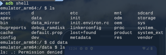 다음과 같이 adb shell을 통해서 emulator에 접속을 했는데 접근이 되지 않을 경우가 있다. 이와 같이 Permission denied 에러로 접근이 안될 때에는 adb shell로 우선 접속 후 run-as <앱 이름>을 통해서 접속을 하면 문제가 해결된다.