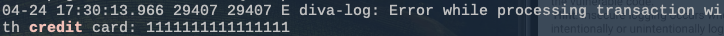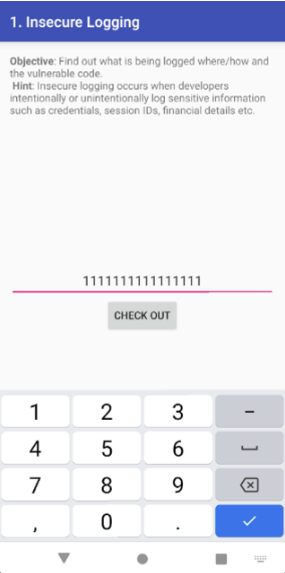 위와 같이 사용자가 올바른 값을 입력하거나 하지 않더라도, check out 버튼을 누르고 adb logcat을 통해 Log 기록들을 확인하면, 아래와 같이 개인정보가 유출된 log가 보이는 걸 확인할 수 있다.