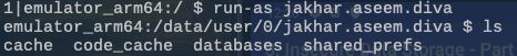 run-as jakhar.aseem.diva 명령어를 통해서, 접속 후, 똑같이 해당 앱 내에서 ls 명령어를 입력하면 아래와 같이 diva 앱에서 사용되는 폴더, 파일들을 확인할 수 있다.