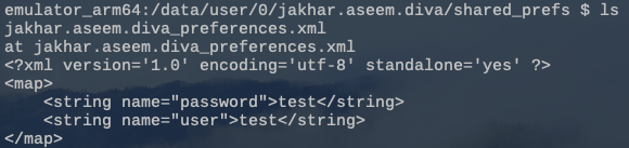 shared_prefs 폴더가 존재하기 때문에 해당 폴더에 접근해 xml 파일을 cat 명령어로 확인하면 다음과 같이 password와 user 정보가 저장된 것을 확인할 수 있다.