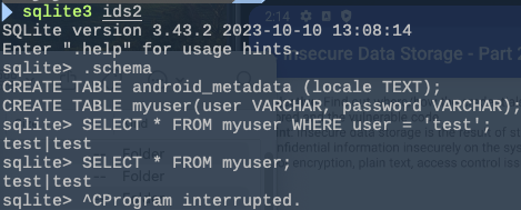 사실 여기서도 입력했던 usr와 pwd의 값인 test test를 확인할 수 있지만, sqlite3 ids2 명령어를 통해 쿼리문을 통해서 해당 값들을 확인해 볼 수 있다.
